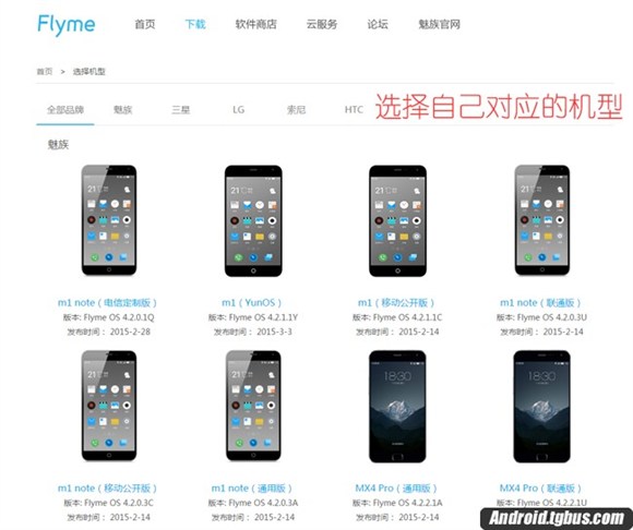 1.登錄Flyme官網www.flyme.cn,點擊頁面上方的“下載”,選擇自己對應的機型,和固件版本,點擊“下載”按鈕。