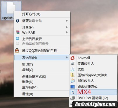 3.在電腦上直接鼠標右鍵update.zip/update.bin文件發送到“MX4”(同理,對應機型會出現相應顯示)即可。
