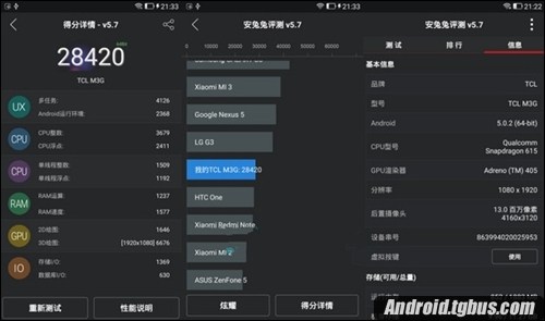 通過安兔兔檢測發現,TCL麼麼哒3S檢測的具體型號是:TCL M3G,其安兔兔跑分成績為28420分,在同配置產品當中屬於正常表現。我們知道高通曉龍615八核處理器是一款定位中低端級別的CPU,但甚至一些中高端品牌手機也采用了這顆處理器,雖然該處理器在跑分方面沒有想聯發科處理器表現得那麼明顯,但對於這款千元級別的機型來說,這樣的表現已經是十分搶眼了,性價比非常出色,也正因為如此,這款手機在上市後也受到了很多用戶們的親睐