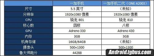 在過去有關一加手機2的傳聞中,曾經有消息稱該機會有兩個版本推出。其中高配版本將加入指紋識別功能,並且會為攝像頭增加光學防抖功能,但未提及標准版本的相關細節。而現在,來自魯大師數據中心公布的信息顯示,一款型號為One A2003新機同樣裝載的是骁龍810處理器,並提供了3GB內存容量,所配備的觸控屏分辨率為1080p。