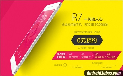OPPO R7的預售時間將持續至5月20日OPPO R7的正式發布,並於5月21日上午10點正式開賣,而且最重要的是,本次預售的貨源相當充足,並將於5月21日同日進行發貨,可見OPPO完全沒有希望R7成為期貨手機的打算,無論OPPO R7是不是你心儀的手機,但“0元預約+免費抽獎”還是吸引力十足的。