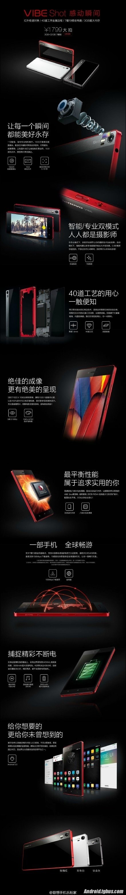 至於配置,聯想VIBE Shot配備5英寸1080p顯示屏,100%NTSC色域,處理器為骁龍615八核64位處理器,搭載基於聯想自家Vibe UI2.5的安卓5.0系統,3GB運行內存和32GB機身存儲,支持最高128GB的擴展,電池為3000mAh。比較驚喜的是,Vibe Shot支持雙卡7模19頻率全網通,通吃三大運營商的所有網絡。而在外觀上,VIBE Shot打造了全球首款紅色鋁合金邊框,正反雙面康寧大猩猩玻璃,聯想還宣稱內置防爆膜,厚度也僅為7.6mm。