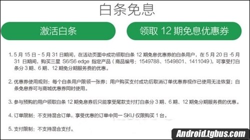 在配置上,兩款新配色和普通版本的配置沒有區別,售價也保持一致。其中,Galaxy S6冰玉藍售價5288元(32GB),S6 edge松珀綠32G、64G版售價分別為6088元、6688元。預訂需先付200元訂金,5月20日搶購成功後,付完尾款。據了解,此次購買新機的京東用戶,可獲得白條免息,享受打白條3期、6期、12期免分期服務費的優惠。此外,購機用戶還將獲得藍牙耳機、充電寶、自拍桿等配件以及免費一年期期意外險。