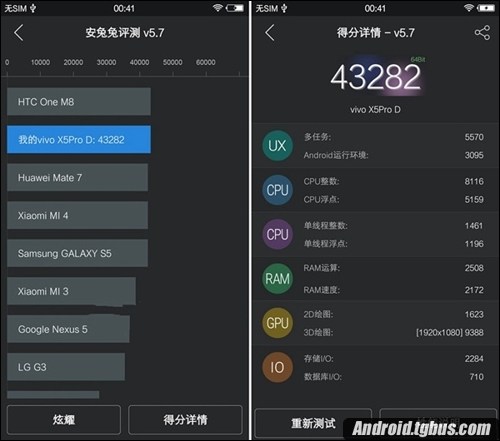 至於大家所關心的vivo X5Pro跑分測試,通過以上vivo X5Pro安兔兔跑分測試來看,vivo X5Pro跑分達到了43282分,雖然不能和目前市面上的主流期間媲美,但是MT6752的性能已經追上甚至超越了去年頂級的旗艦手機,所以硬件方面這款手機還是值得期待的。