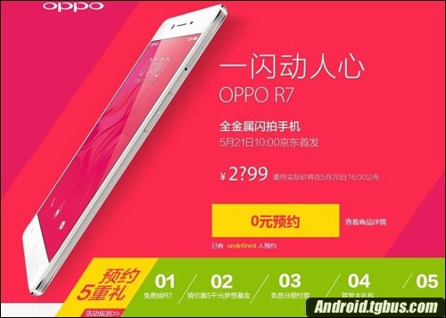至於OPPO R7什麼時候預約?據悉,這款手機今天正式開啟0元預約,OPPO官網和京東商城都可以參與預約了,目前該手機售價還不清楚,此前透露的消息稱可能為2999元,小編個人預計該機可能會在2599-2999元之間。