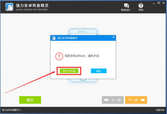 8、接下來如果你的手機未ROOT,軟件會提示:“手機未ROOT”。此時點擊免ROOT恢復按鈕進入下一步。