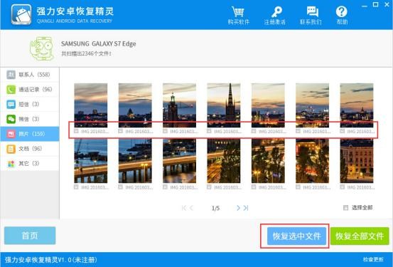 4.恢復:在強力安卓恢復精靈(安卓恢復精靈)左側選擇“圖片”,查看手機上的照片文件,找到想要恢復的照片,點擊勾選,然後一鍵按下“恢復選中文件”按鈕即可恢復安卓手機誤刪的照片文件。