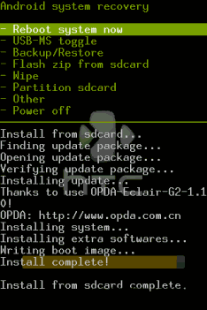 5. 當屏幕最下方的英文出現 complete,並回到recovery主頁時,就說明刷機成功了!