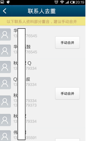 4、對一些帶相同號碼不同名稱的聯系人,軟件進一步提供手工合並的功能。