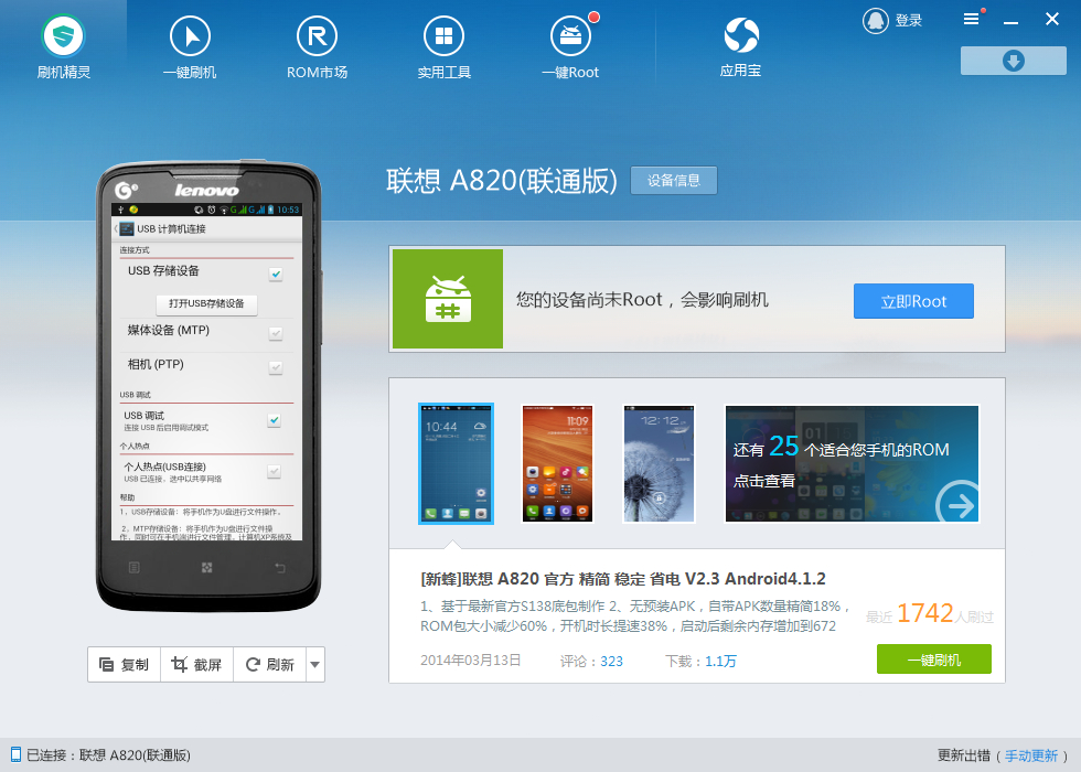 線刷方面應該將USB數據線連接到電腦主機箱後面,以保證供電充足,刷機之前應該確保驅動程序正確安裝能夠正常連接手機。