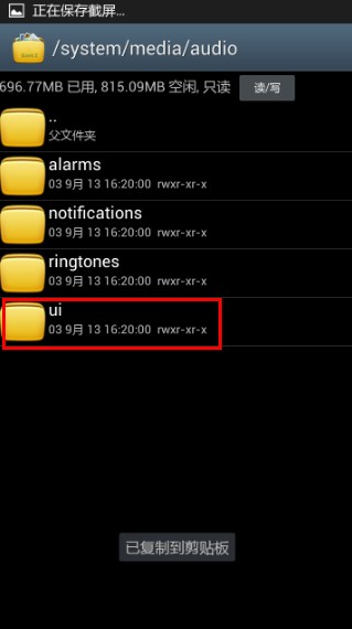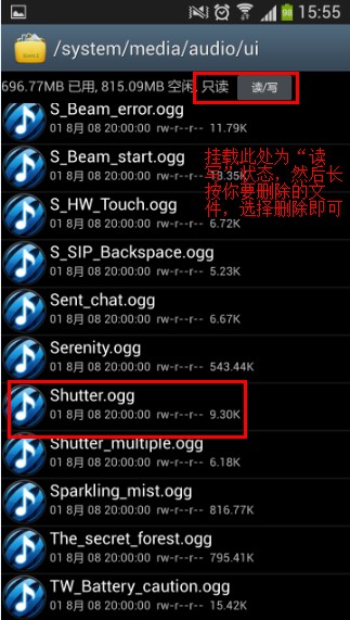 2、依次打開 system/media/audio/UI/ 看到shutter.ogg文件,將其刪除即可。如果刪除時提示不能刪除請先掛載權限後再刪除!