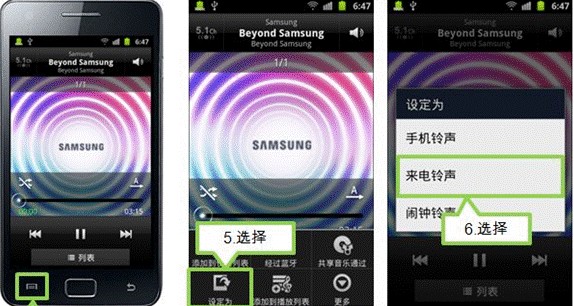 1、先在菜單裡找到音樂播放器,然後在選擇你要設置成鈴聲的歌曲,設置鈴聲。具體操作如圖: