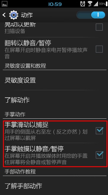 除此之外,三星從Galaxy S3之後開始都具有一個更酷的截圖方法。就是在設置-動作-手掌動作裡開啟一個手掌截圖的方法。