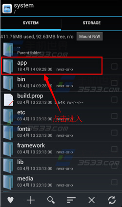 4:接著打開到/system/app位置,可以看到裡面有眾多的apk程序,如果你是官方的原生系統,由於官方的系統未作deodex操作,還會看到同名的odex文件。