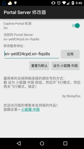 首先安裝裝“Portal Server修改器”App後,修改服務地址為“小狐狸.中國”。
