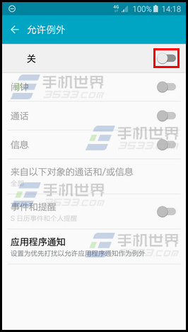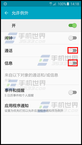 7.點擊【關】右側滑塊,顯示【開】代表開啟,然後選擇允許例外的程序,這裡以開啟【通話】、【信息】為例。