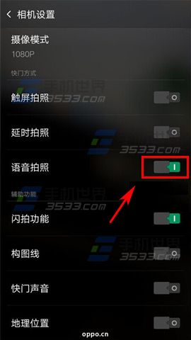 1)進入OPPO R7Plus的相機界面,點擊右下角五圓進入,點擊【齒輪】進入相機設置,開啟【語音拍照】按鈕即可。(如下圖)(注:在拍照時,對著手機說“拍照”、“茄子”等字眼即可免去點按拍照鍵,直接拍照!)