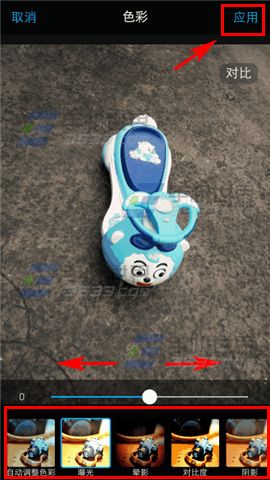 2)點擊【色彩】進行顏色調整,選擇一種【效果】,按住【按鈕】左右調整強度。完成後點擊【應用】保存。(如下圖)