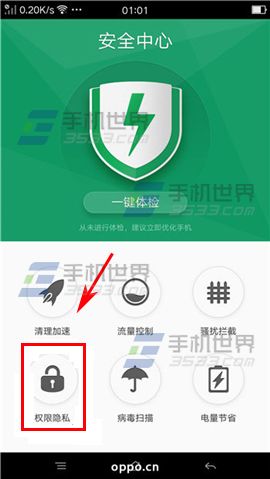 1)進入OPPO R7Plus的安全中心,點擊【權限隱私】,再點擊【程序加密】。(注:OPPOR7Plus程序加密的方法請參考相關教程)(如下圖)
