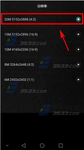 1)打開榮耀7的相機設置,點擊下方【齒輪】,在設置界面點擊【分辨率】。(如下圖)