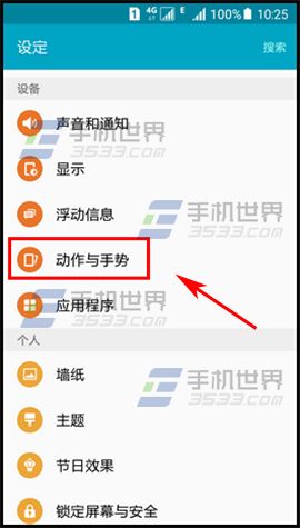 1)點擊打開三星S6的【設置】,在設備一欄點擊【動作與手勢】。(如下圖)
