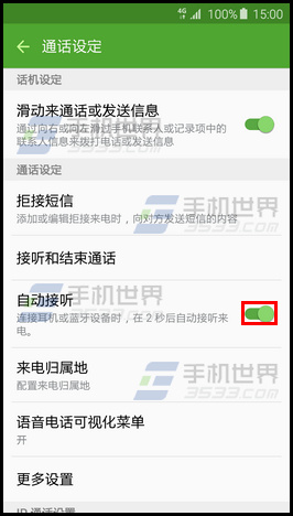 3)點擊【自動接聽】右側的滑塊,綠色代表開啟。 (如下圖)