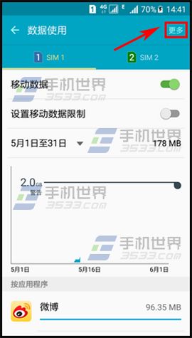 3)即可查看到移動數據的使用情況,點擊【更多】,再點擊【顯示WLAN使用量】。(如下圖)