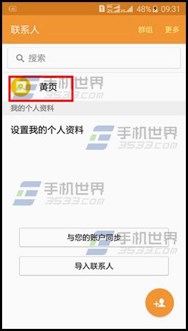 1)在桌面點擊【聯系人】,進入後點擊聯系人界面的【黃頁】。(如下圖)