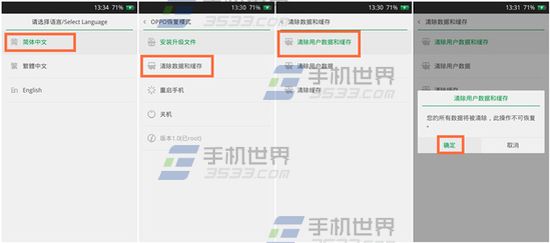 1)首先將OPPO R7關機,按住【電源鍵】和【音量減】,進入OPPO恢復模式,點擊【簡體中文】,點擊【清除數據和緩存】,選擇【清除用戶數據和緩存】,點擊【確定】。(如下圖)