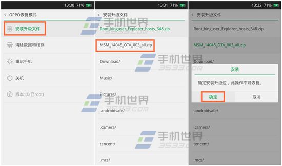2)在OPPO恢復模式中點擊【安裝升級文件】找到並點擊【zip包】點擊這【確定】即可。PS:請自行下載最新的zip包。(如下圖)