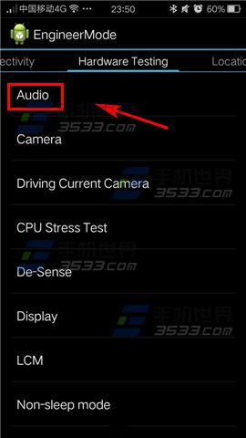 1)在OPPO R7撥號界面輸入【*#800#】在【Hardware Testing】欄中點擊【Audio】。(如下圖)