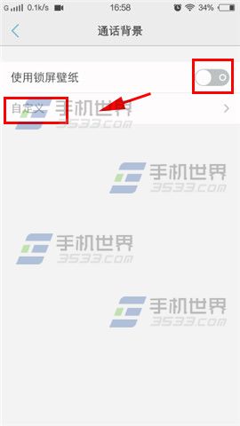 2)點擊【通話背景】,開啟【使用鎖屏壁紙】後,點擊【自定義】。(如下圖)