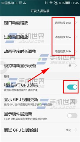 打開華為P8【全部設置】點擊【開發人員選項】,將【窗口動畫縮放】和【過渡動畫縮放】及【動畫程序時長調整】都修改成0.5X,再將【強制進行GPU渲染】開啟。PS:前面三個選項修改成0.5X,可使手機界面切換的速度會明顯加快。,後者GPU渲染可減輕CPU的負擔能實現應用軟件的提速,不建議長期開啟。(如下圖)
