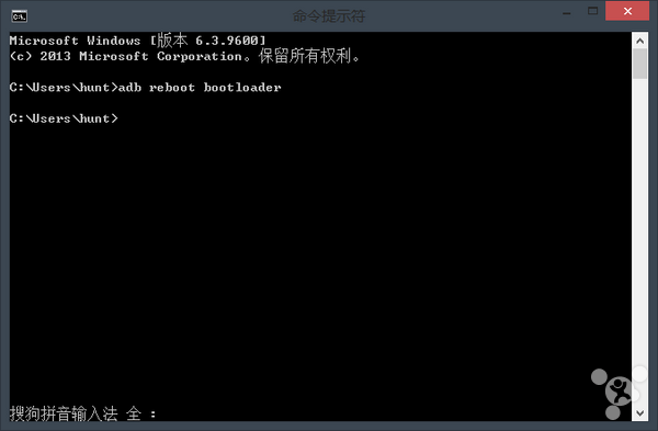 在電腦的 CMD 模式中輸入“adb reboot bootloader”命令進入 bootloader 模式,或者把設備關機,在關機狀態下同時按下“音量-”和“電源鍵”手動進入 bootloader 模式