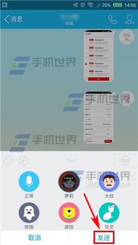 3)錄制完後點擊【正方形】按鈕結束,即會出現變聲特效選擇,蘿莉、大叔、驚悚、搞怪還有空靈五款變聲特效中選取一款後點擊【發送】即可。(如下圖)