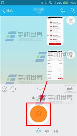 2)接著用手指向左劃,切換到變聲模式,點擊【橙色】按鈕進行錄音。(如下圖)