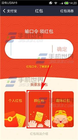 1)打開支付寶,點擊【紅包】入口,接著點擊【群紅包】按鈕。(如下圖)