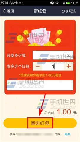 2)輸入金額和紅包數量後,點擊【塞進紅包】,輸入支付密碼點擊【確定】。(如下圖)