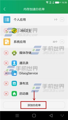 3)然後在個人應用中找到【最美天氣】,點擊左邊的【+】號,即可,再返回到內存加速白名單,就會發現最美天氣已經在裡面啦!(如下圖)