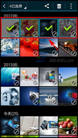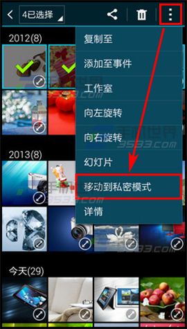1)打開三星S6的【相冊】,點擊右上角的【...】,點擊【選擇】,然後勾選需要移動到私密模式的照片;(如下圖)