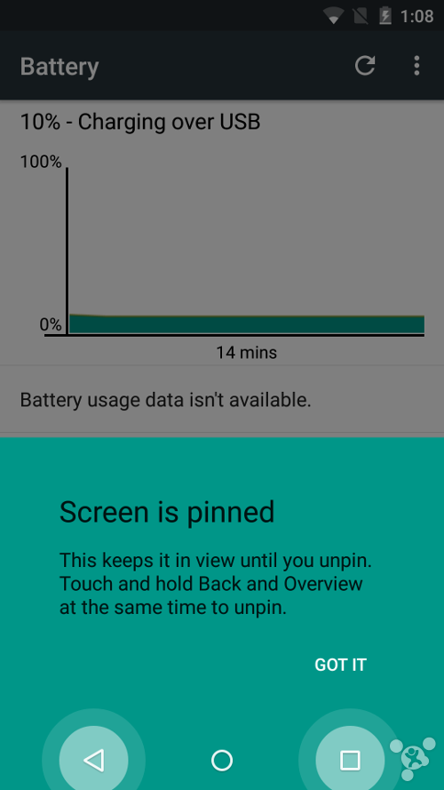 Android Lollipop 系統引入了一個屏幕固定功能,不過這一功能不夠完善,在新版系統中,它變得更加容易操作。打開一個想要固定(釘住)的應用,然後在應用切換處點擊 Pin 圖標即可。