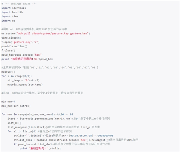 從程序本身來說,得到解鎖密碼後應該用break跳出循環並終止程序運行。但Python並沒有跳出多重循環的語句,如果要跳出多重循環,只能設置標志位然後不停進行判定。為了運行速度就略去了“跳出循環”這個步驟。(有沒有更好的實現跳出多重循環的方法?)另外也略去了很多容錯語句。