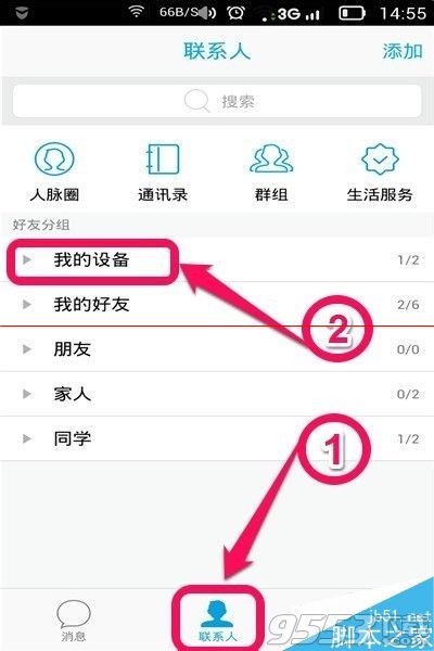 2、在打開的“手機QQ”的界面上,出現很多功能選項,如圖所示,我們點擊選擇裡面的“聯系人”,接著點擊“我的設備”按鈕。