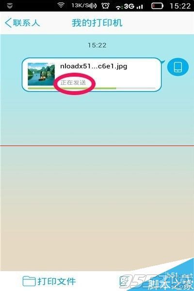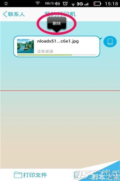 7、選取了打印機後,就可以看到照片在傳送中。(傳送時間的長短取決於手機網絡信號的質量)如果錯選了照片,不想打印了,可以在圖片上長按,出現“刪除”字樣後,點擊“刪除”就可以取消這次打印過程了。