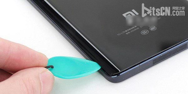 小米Note正面采用2.5D弧形玻璃屏幕設計,背面則采用弧度更大的3D弧形玻璃設計,拆機時從背面開始的。小米Note後蓋采用了卡扣式固定,拆機前需要借助薄片從細節的劃痕處開始找到缺口,如下圖所示。