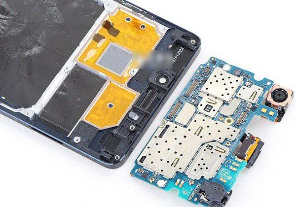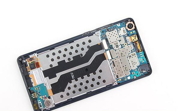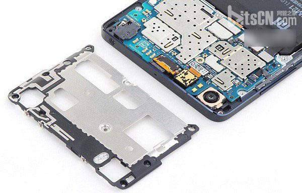小米Note核心硬件都位於機身頂部的這塊PCB主板上。並且頂部固定中框也根據主板芯片位置不同,精雕出不同的區域,能夠起到屏蔽芯片信號之間的干擾作用。