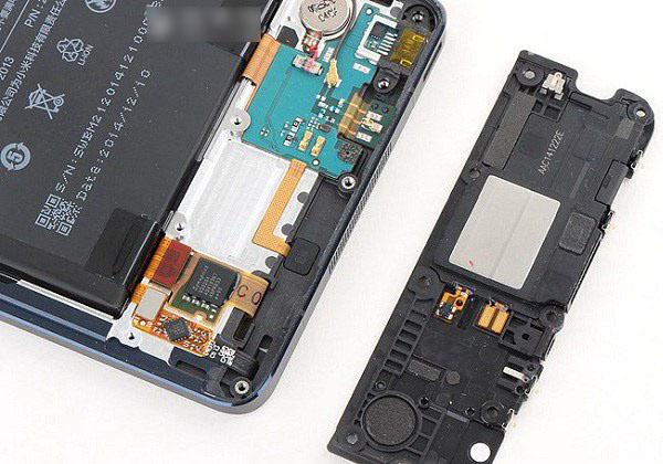 小米Note機身底部配備了一體化音腔,拆解上非常簡單。從底部的揚聲器模塊上看,小米Note采用了Smart PA技術,使得外放音量和音質領先於其他小米手機。