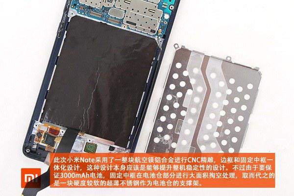 小米Note采用了一整塊航空鋁鎂合金進行CNC精雕,邊框和固定中框一體化設計,這種設計本身應該是能夠提升整機穩定的。不過由於要保證3000mAh電池,固定中框在電池倉部分進行大面積掏空處理,取而代之的是一塊硬度較軟的超薄不銹鋼作為電池倉的支撐架,如下圖所示。