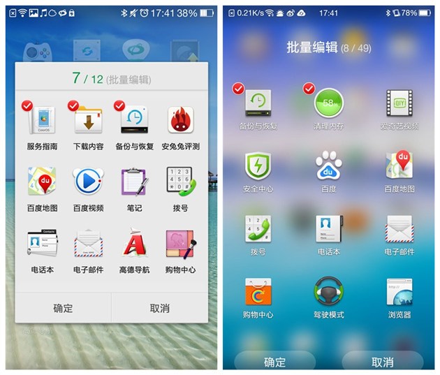 注意兩幅圖的右下角,OPPO N3搭載的Color OS 2.0已經徹底取消了“應用程序界面”,所有應用直接擺在桌面上,同時可以看到,像“電話本”“軟件商店”“音樂”等系統圖標得以重新繪制,相比先前更為簡潔舒爽。