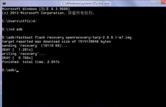 如圖所示提示finished證明成功刷入Recovery。